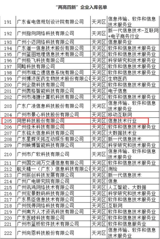 网思科技凭借雄厚的技术实力成功获得CMMI5、CCRC、6个ISO标准认证等资质,并被授予国家专精特新小巨人企业、国家高新技术企业、广东省专精特新中小企业和广州未来独角兽创新企业等多项政府和行业的重要荣誉。